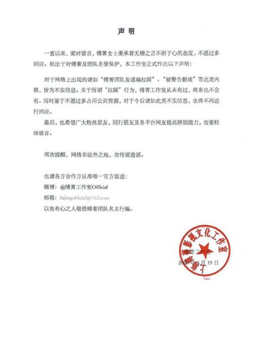 推踩本題目:傅菁工做室便推踩一事收聲明:無稽之止